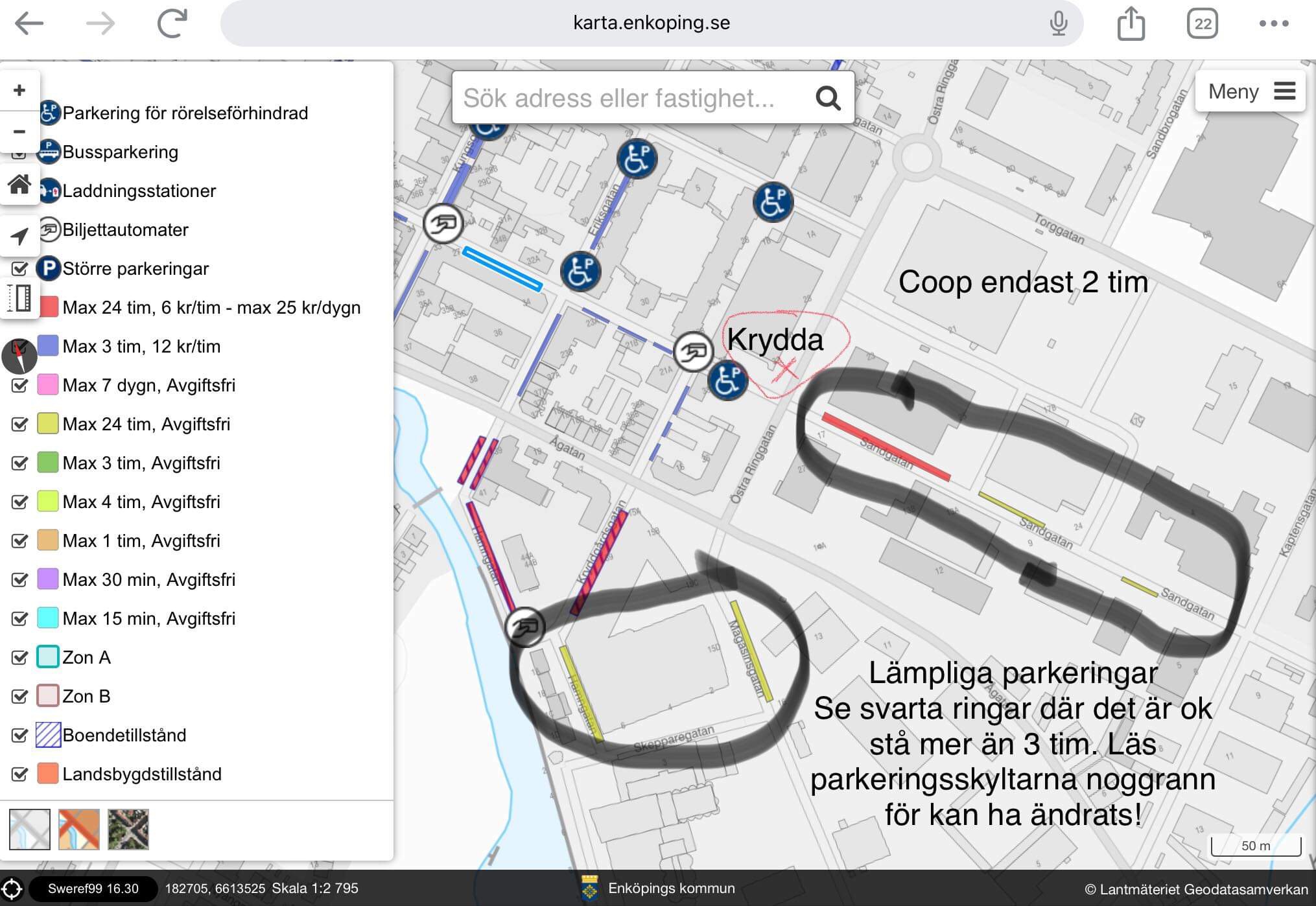OBS! För er som kommer med bil så har tyvärr Coop ändrat till bara 2 tim gratis parkering med p-skiva så parkerar ni där måste ni flytta bilen i pausen. Parkeringsplatser hittar ni på kommunens hemsida https://enkoping.se/bo-trafik-och-miljo/parkering.html klicka på Hitta parkeringsplatser. Se karta nedan lämpliga kommunala parkeringsplatser nära Krydda. Ta med p-skiva. Du kan betala med kort vid parkeringsautomaterna eller genom apparna Parkster, Mobill och Easypark. Oklart dock om alla har P-automat så säkarast vara förberedd med någon av apparna. Av de jag markerat är de gröna gratis medans den röda har avgift 6 kr tim tom kl 19 därefter gratis.