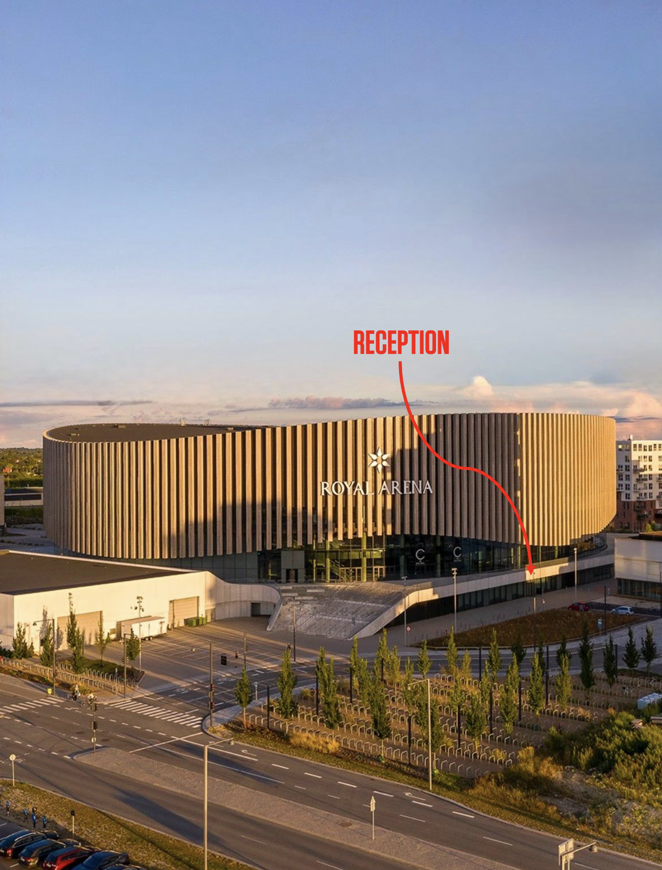 Day-Of Information. Please meet at the main entrance of the Arena at Reception. Arrive early as once the tour departs, not late arrivals may enter. The address is Royal Arena, Hannemanns Allé 18 2300 Copenhagen S Denmark. Direction and other information is available here: https://www.royalarena.dk/en/location-%E2%80%93-directions