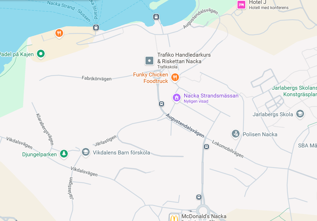- Sväng höger vid avfart Nacka C/Jarlaberg/Nacka Strand, kör rakt fram i första rondellen.
